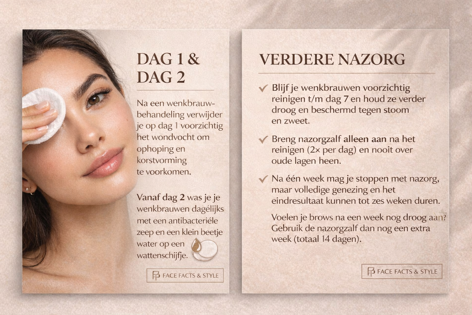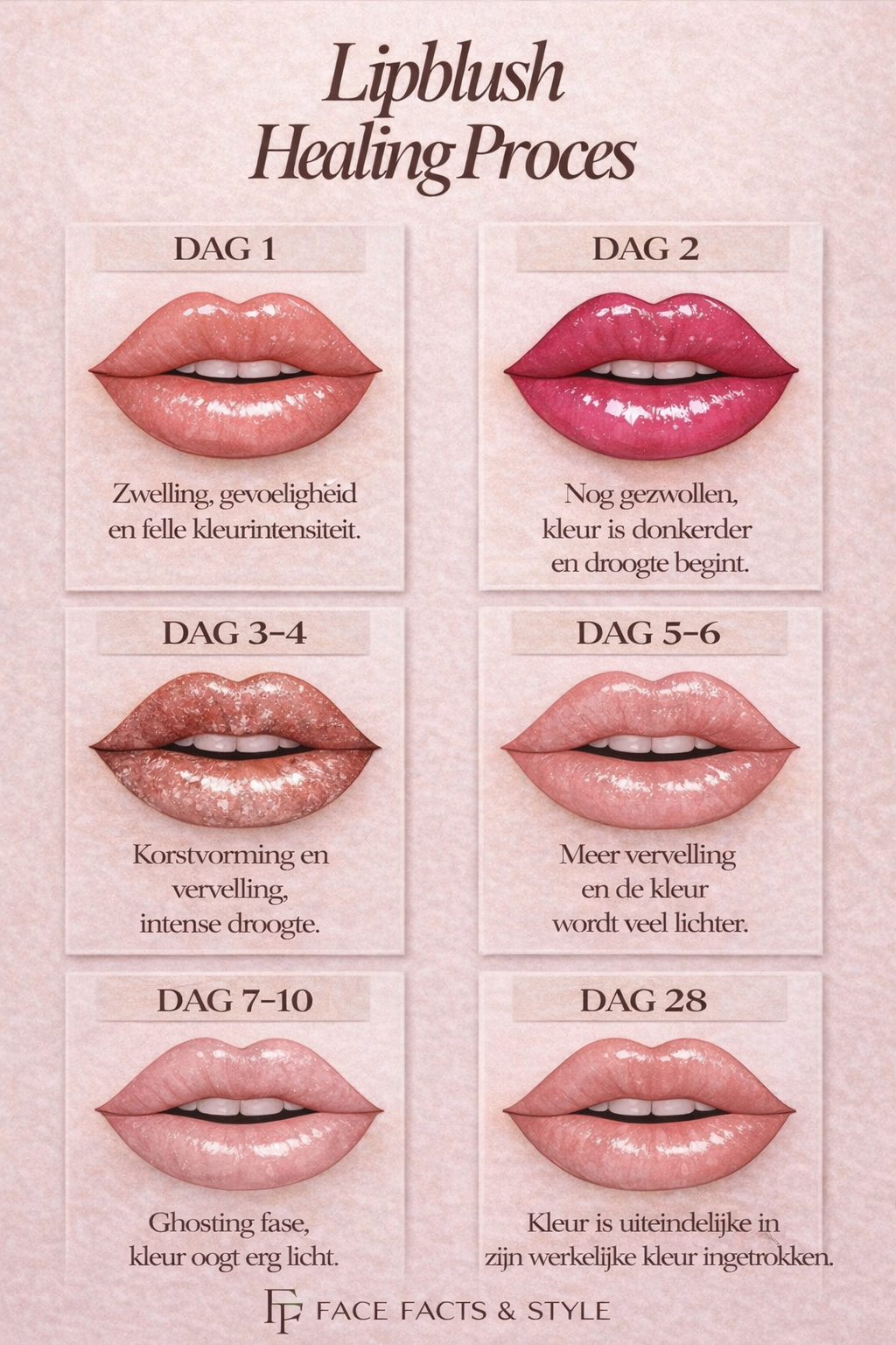 • Dag 2–6: houd het gebied schoon; gebruik een dun laagje nazorgcrème; vermijd make-up, sauna, zwemmen, intensief sporten en zon.